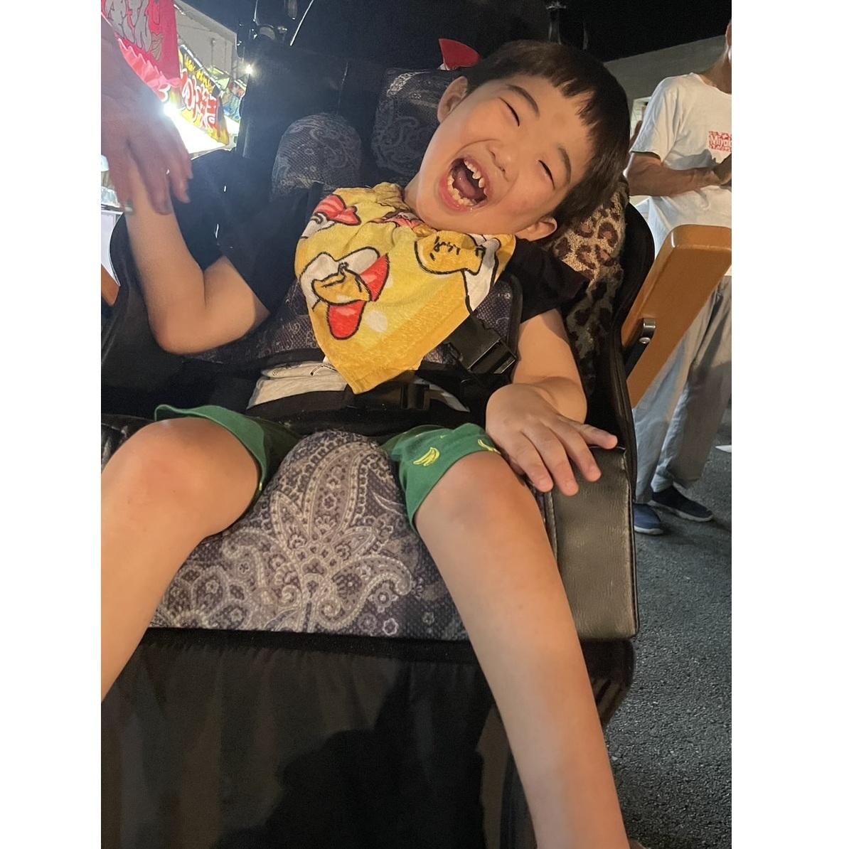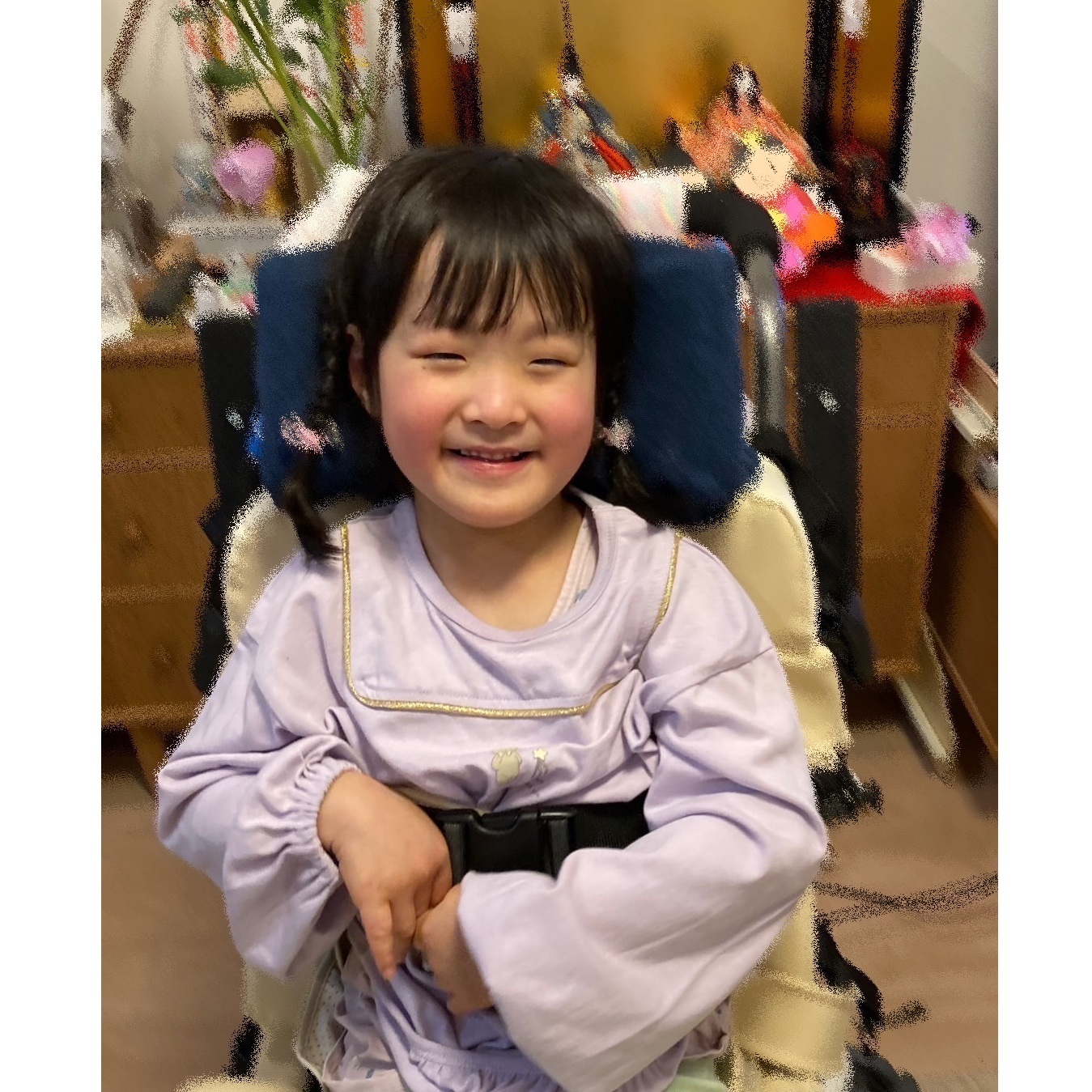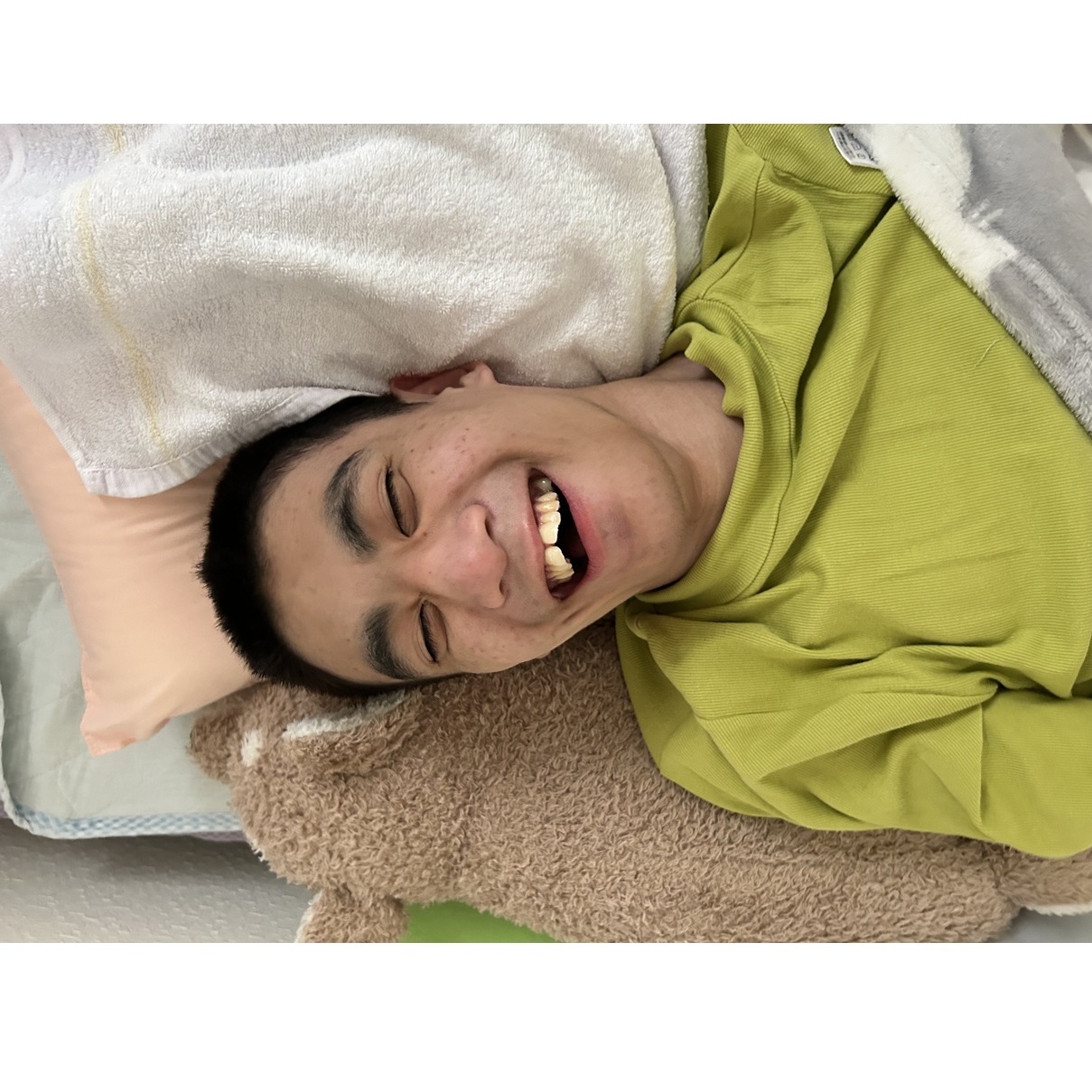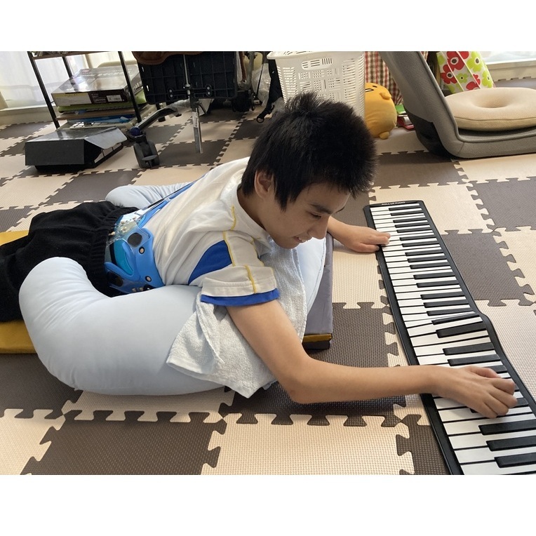 日常性では自立、歩行、有意語の発語、物をつかむ事などは出来ませんが、好きな物や音に対しては全身で嬉しさを表現してくれます。